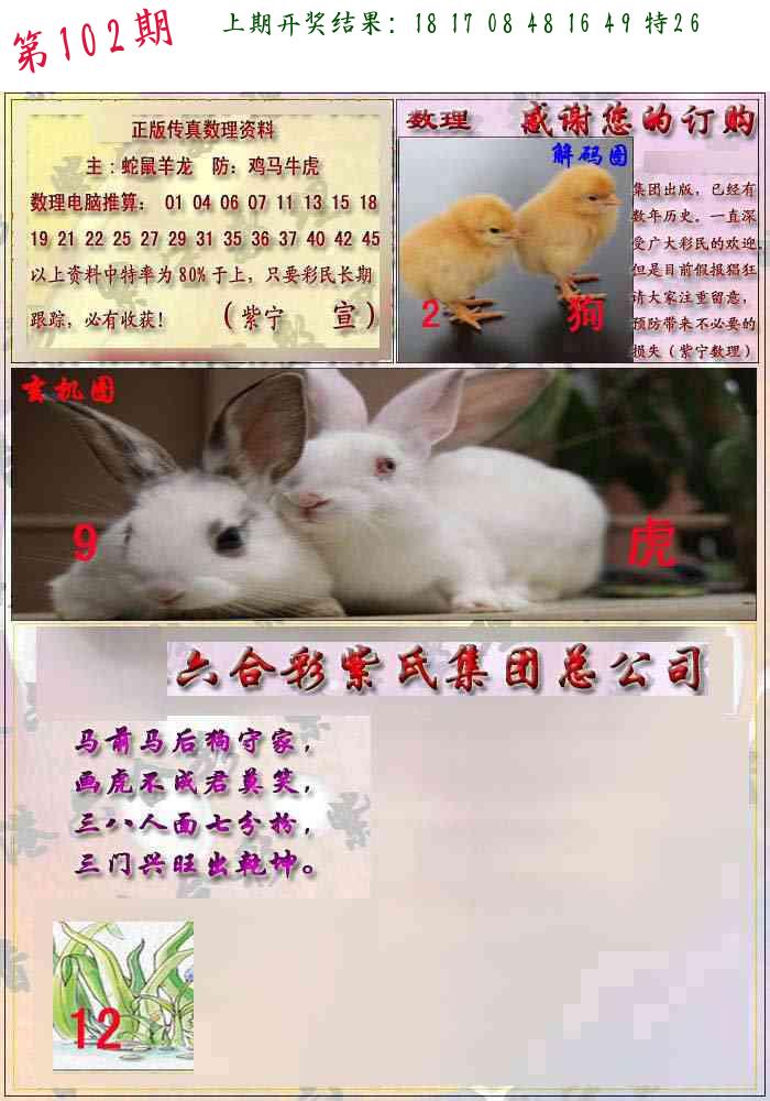 【兔羊蛇】【猪羊猴】【兔鸡猪】 【鸡羊鼠】【马虎鼠】【猪兔狗】 |